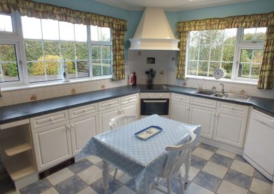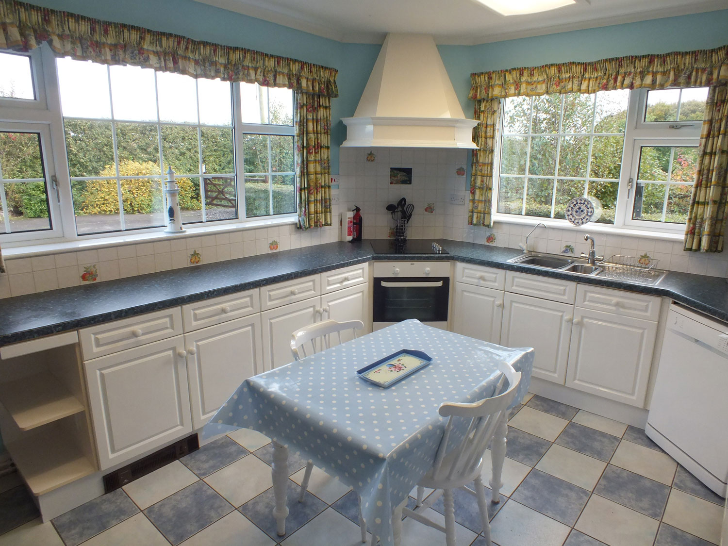 The kitchen has a tiled floor and is equipped with electric cooker, microwave, fridge-freezer, dishwasher, washing machine and tumble dryer.